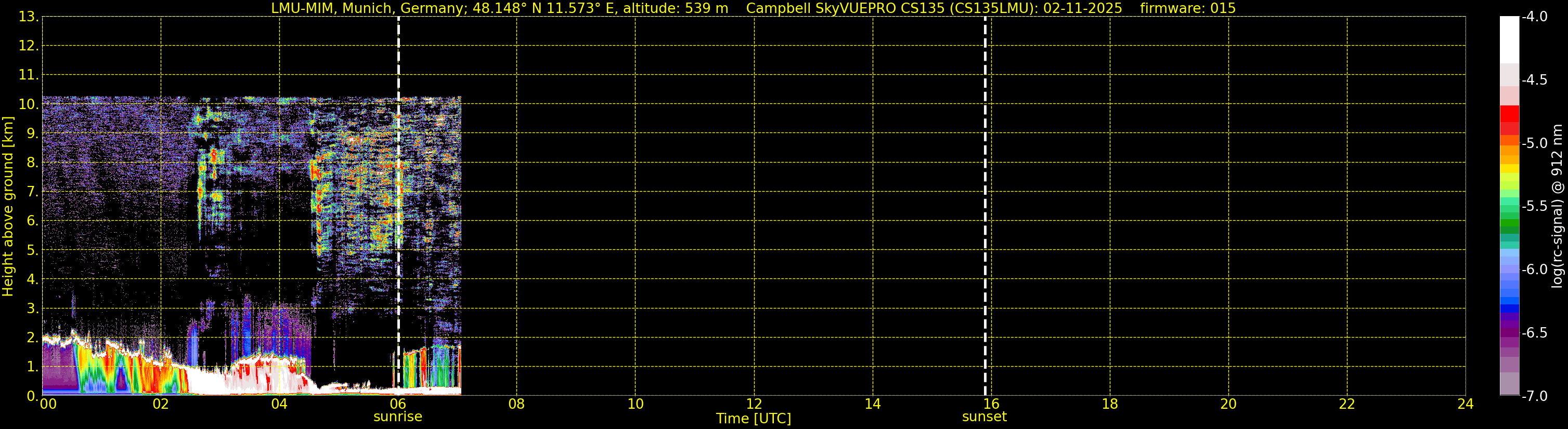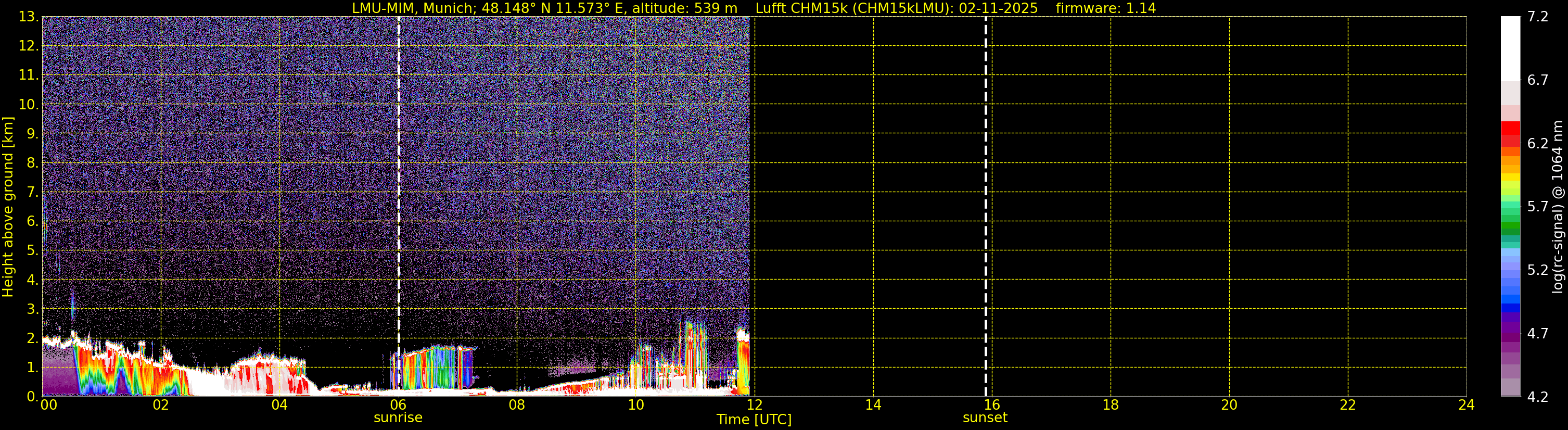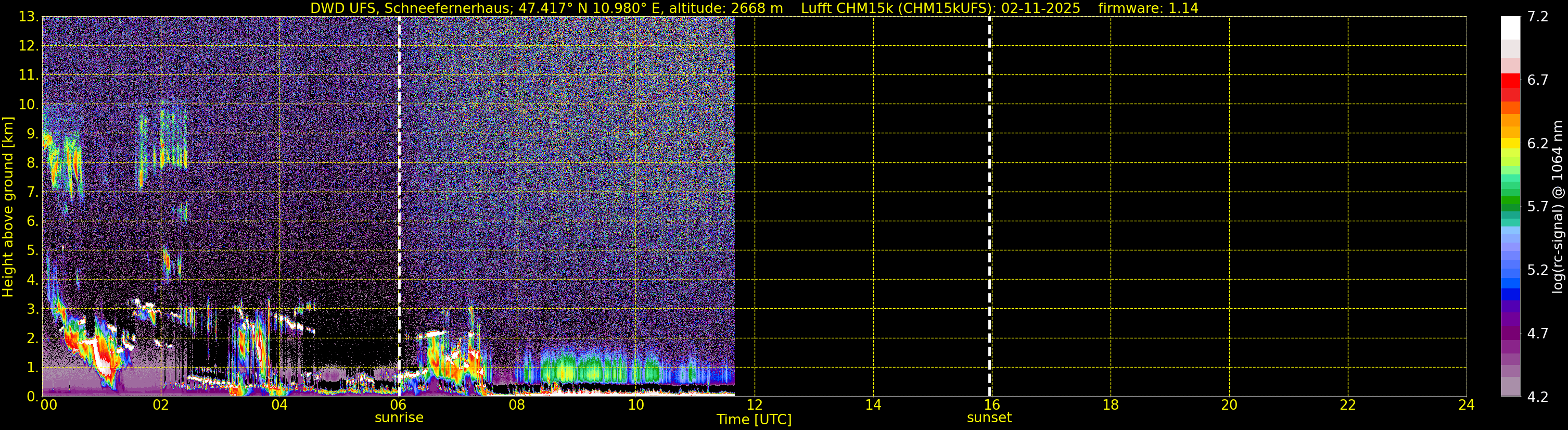 We are grateful that we are allowed to process the corresponding data (since 1. June 2010) of the CHM15k ceilometer located at the Umweltforschungsstation Schneefernerhaus on Zugspitze (UFS, altitude 2712 m, 93 km south of Munich), owned by the UFS and operated by the German Weather Service for comparison.