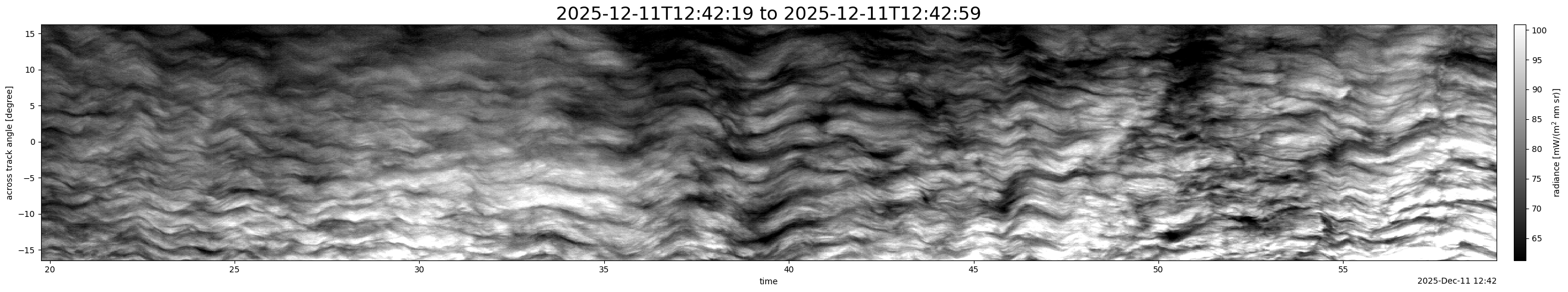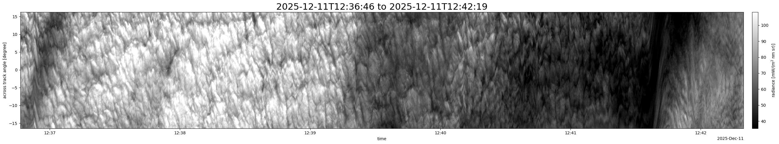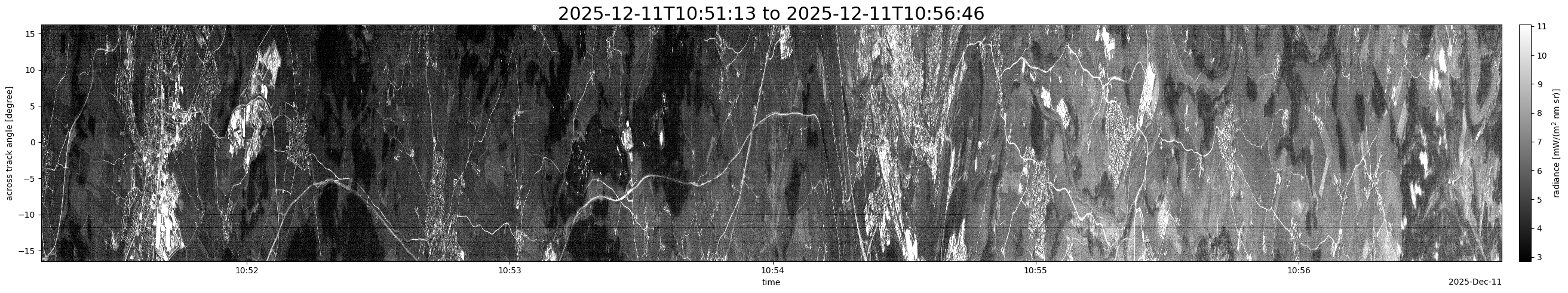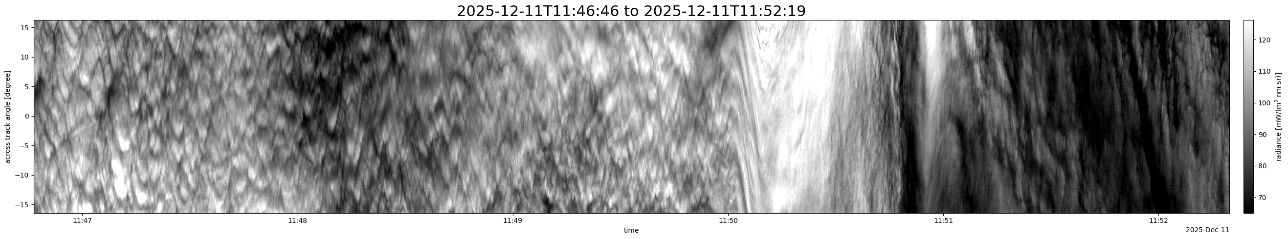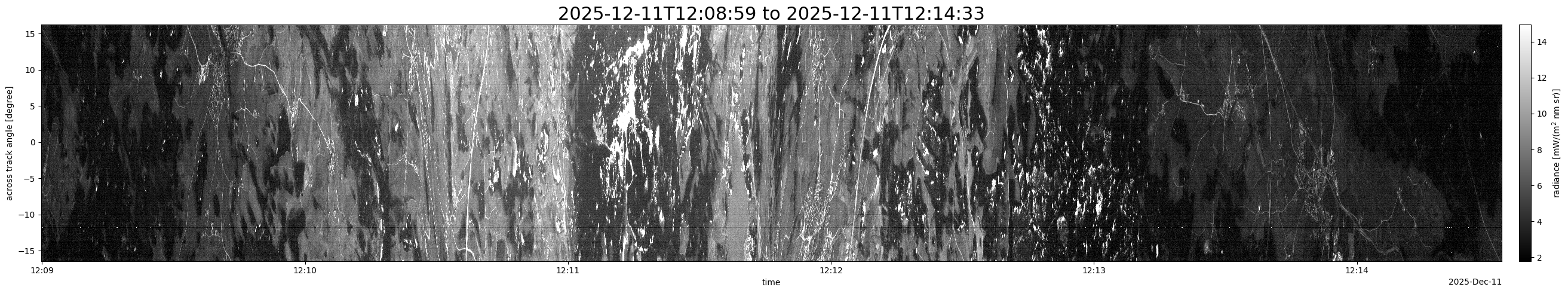 Note that due to the scanning nature of the sensor, the across-track axis is angular resolved while the along-track axis (time-axis) is linear along the flight track.