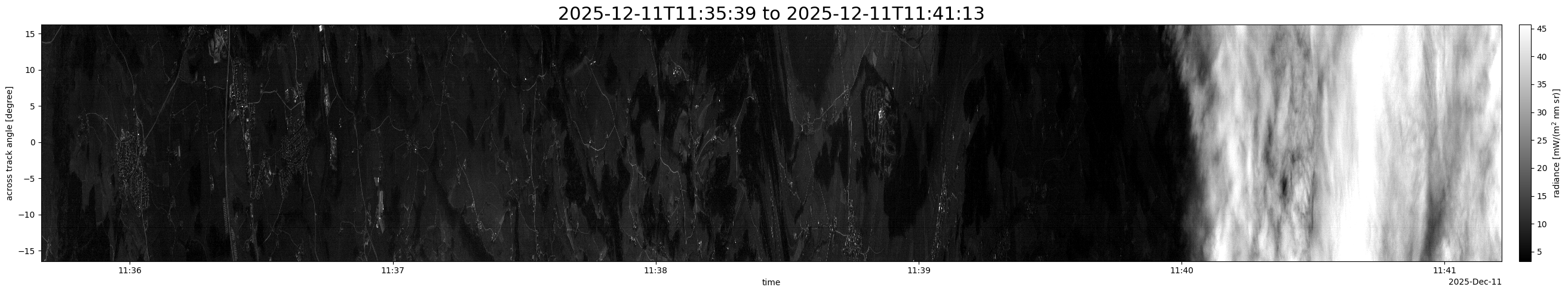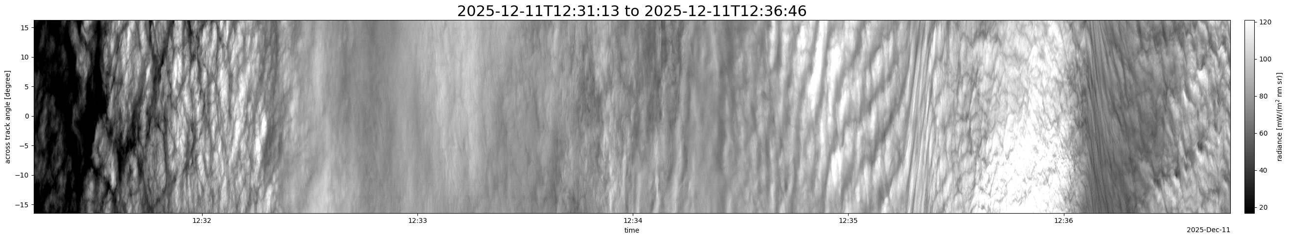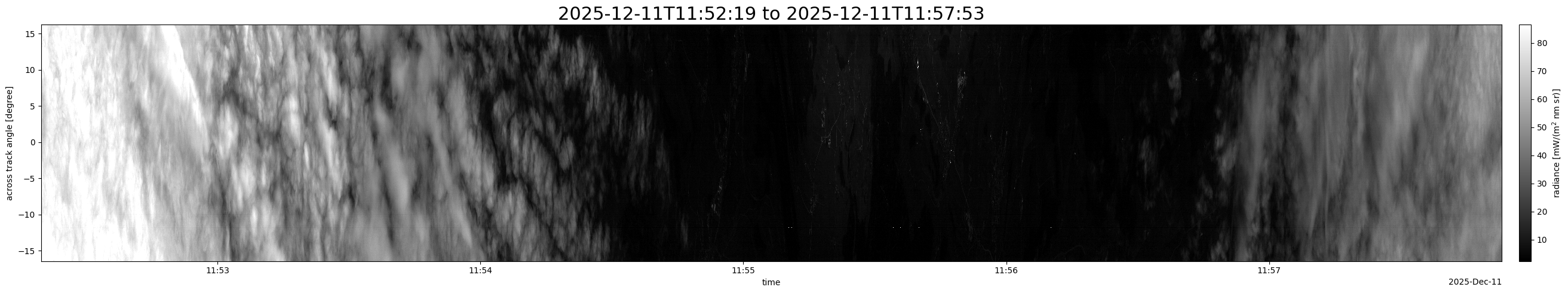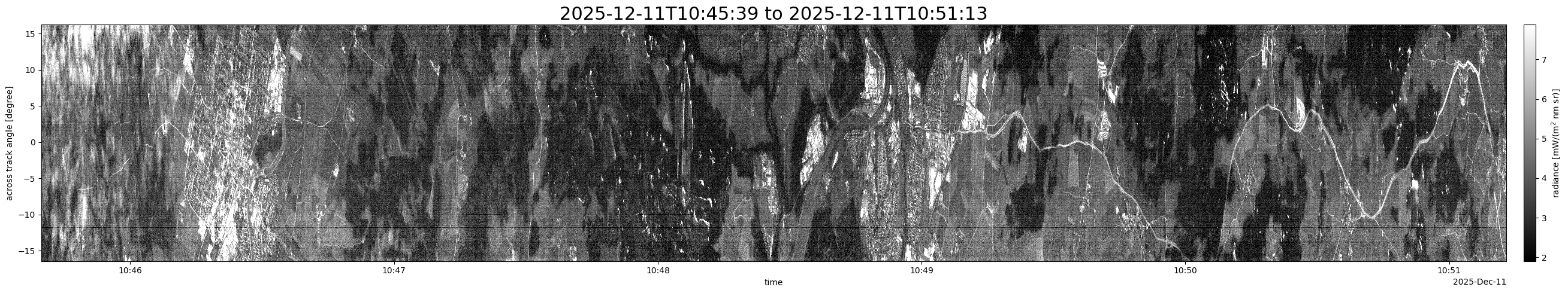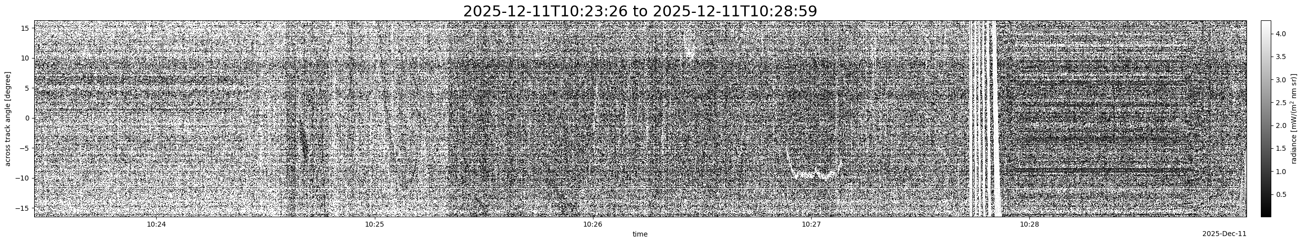 Note that due to the scanning nature of the sensor, the across-track axis is angular resolved while the along-track axis (time-axis) is linear along the flight track.