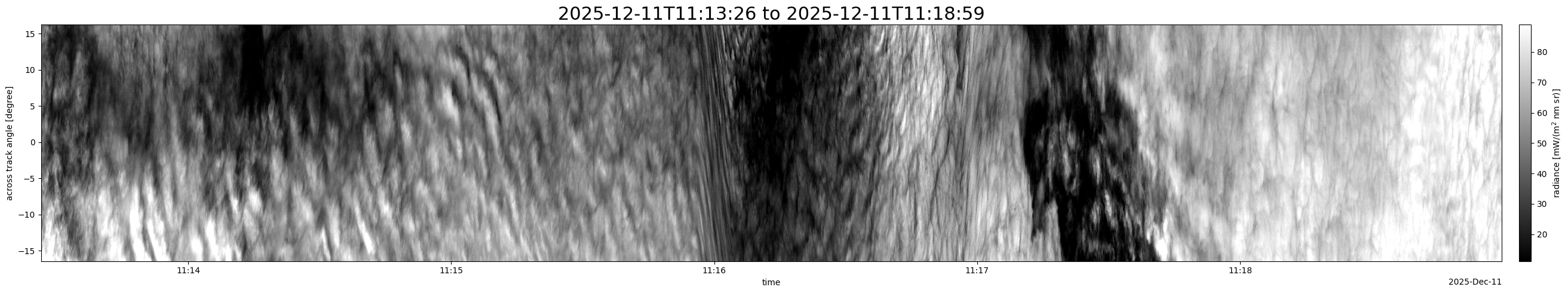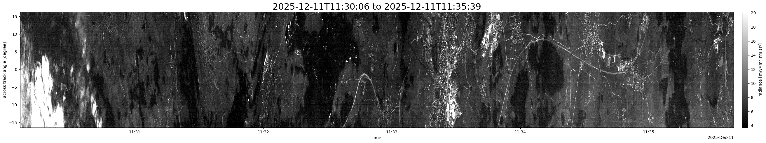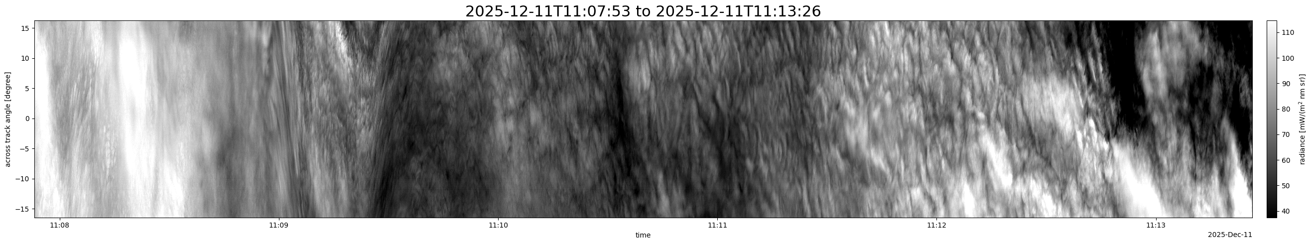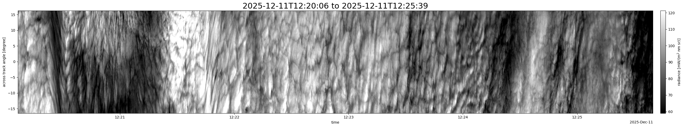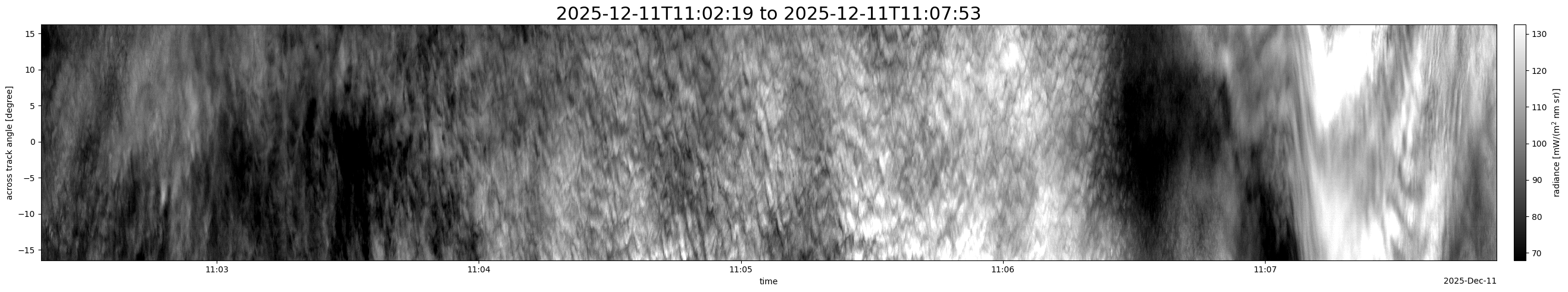 Note that due to the scanning nature of the sensor, the across-track axis is angular resolved while the along-track axis (time-axis) is linear along the flight track.