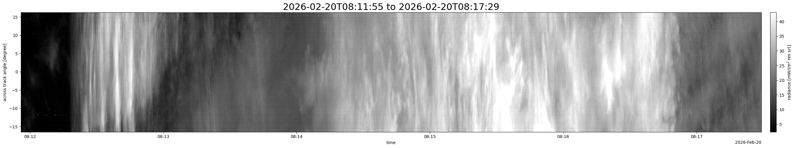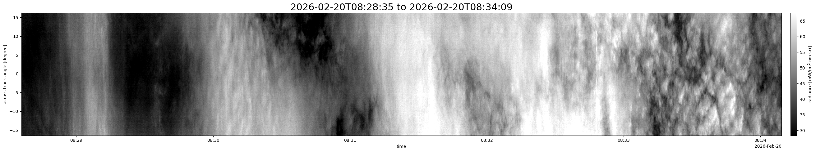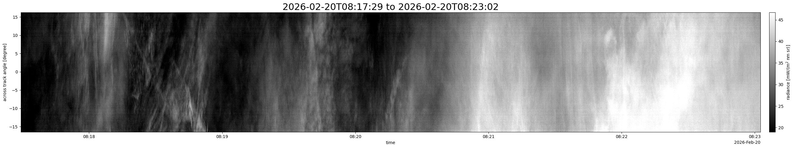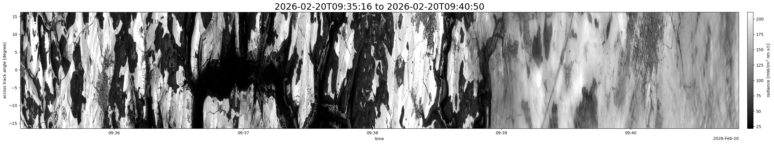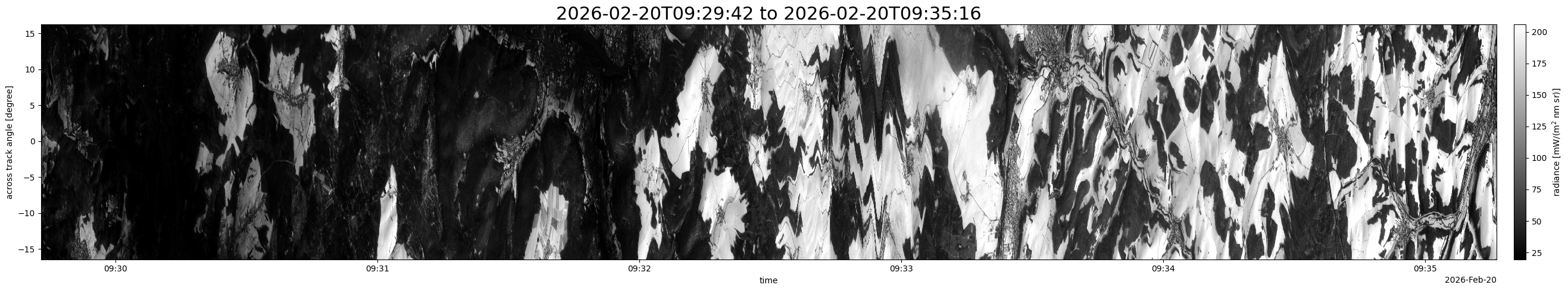 Note that due to the scanning nature of the sensor, the across-track axis is angular resolved while the along-track axis (time-axis) is linear along the flight track.